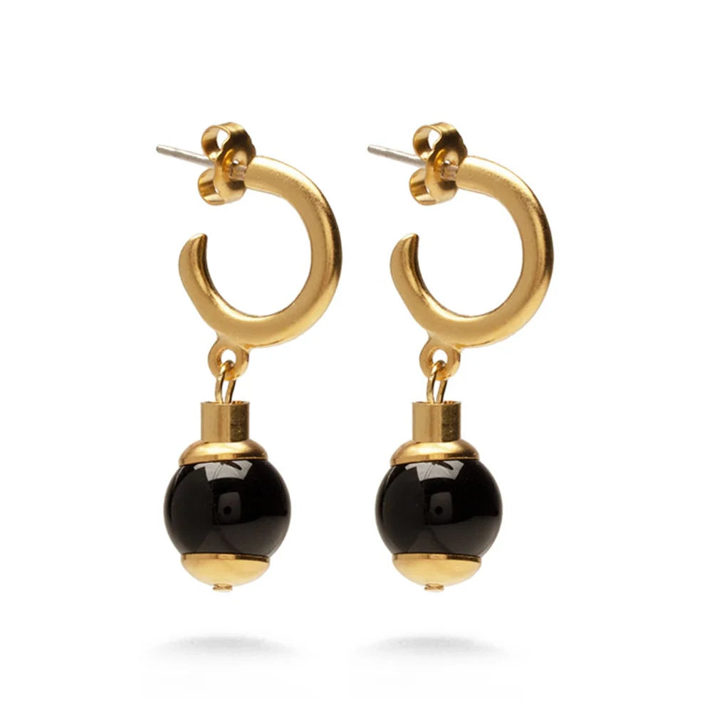 The earrings are crafted in sterling silver with 22 carat gold plating and feature onyx stones.