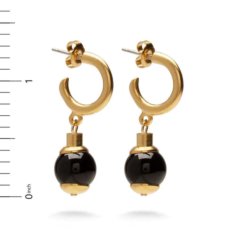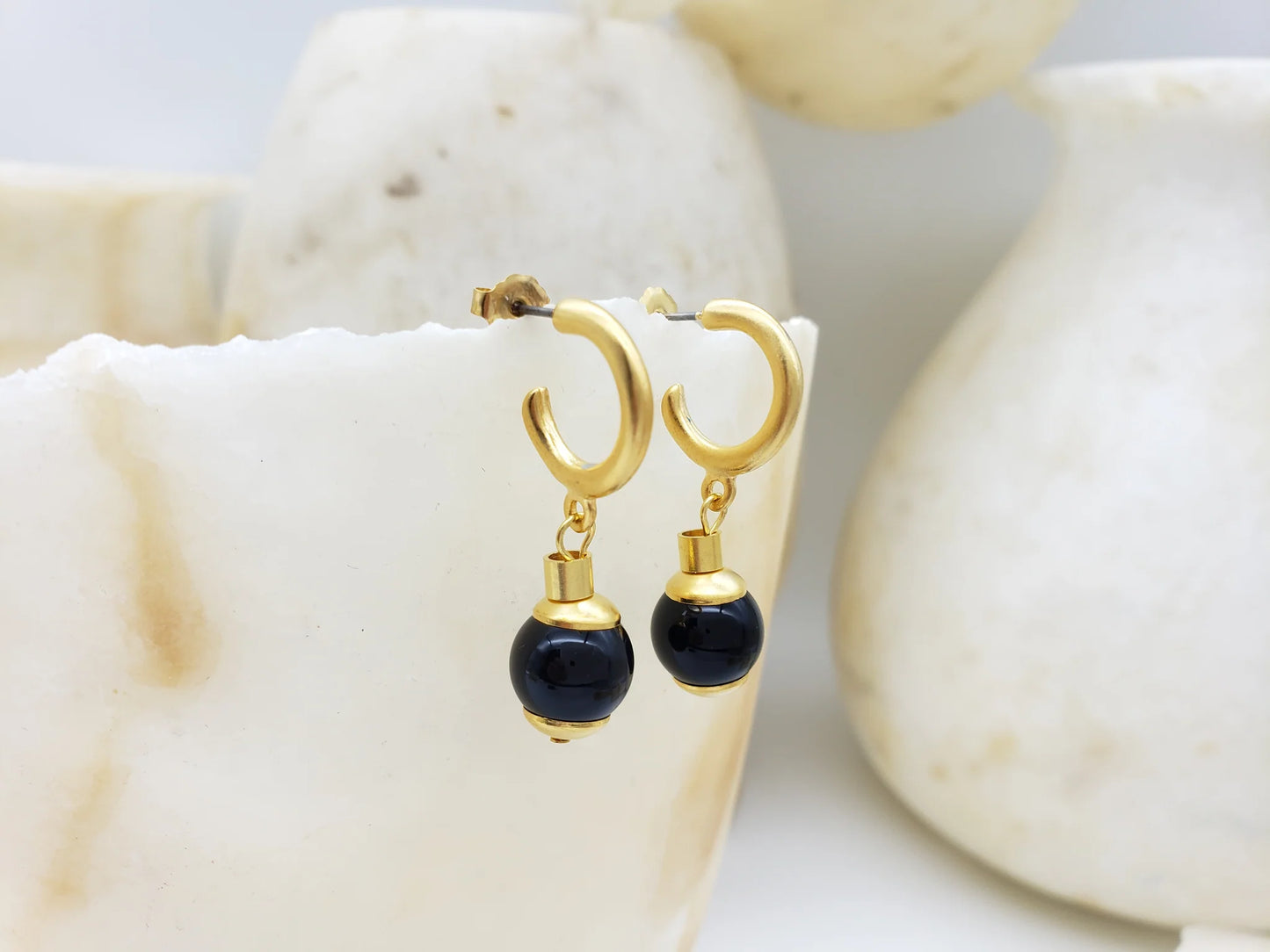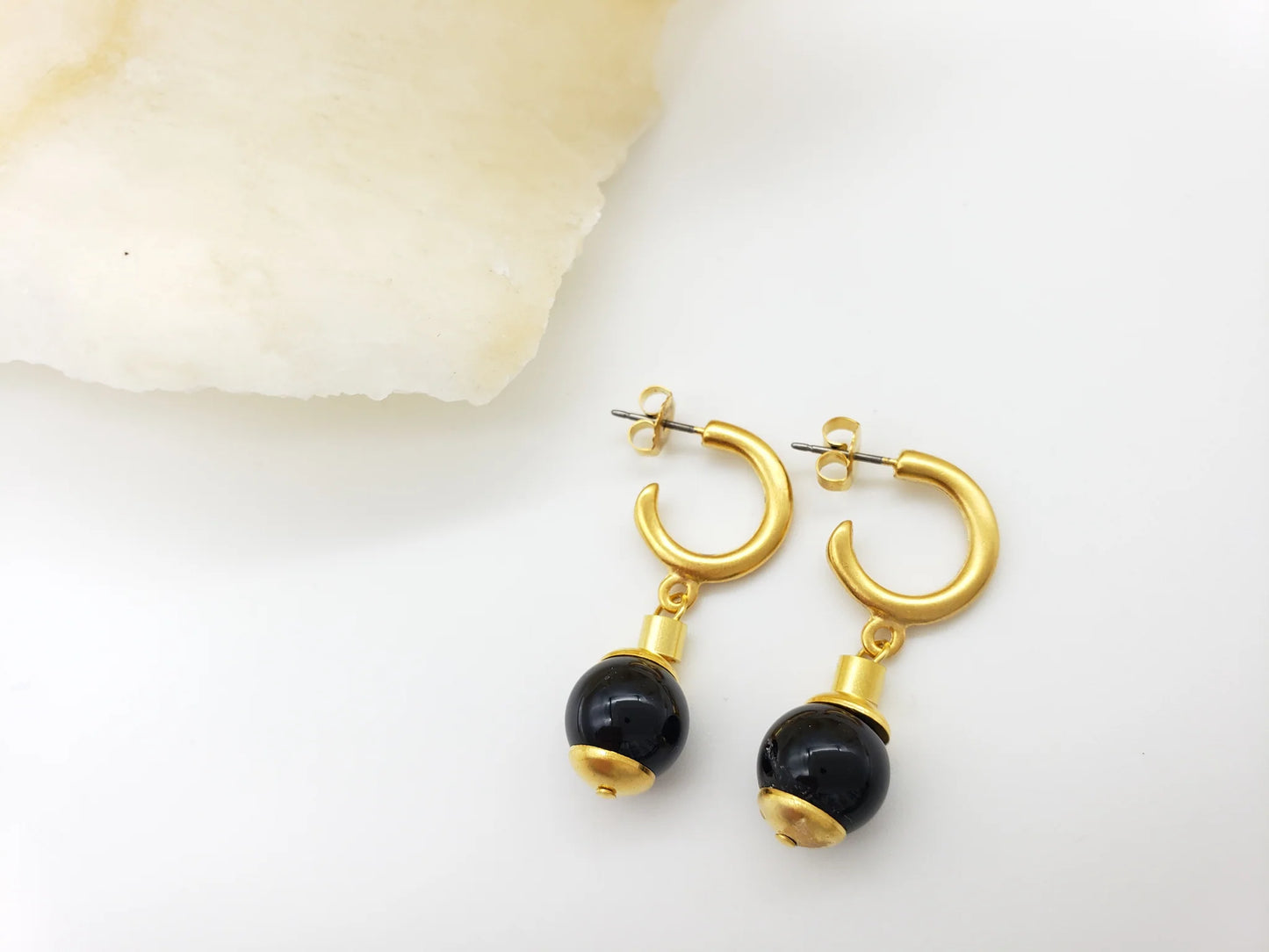 Materials: pewter findings with gold finish, black onyx stone, surgical steel earring post