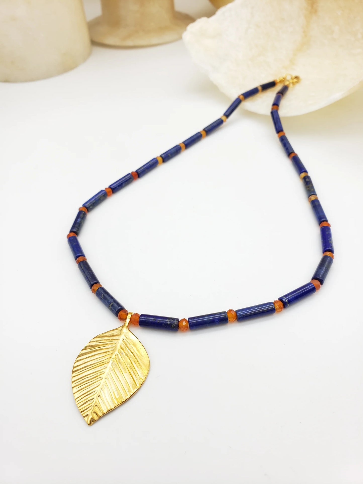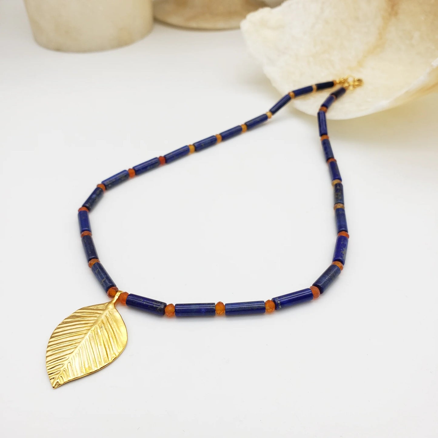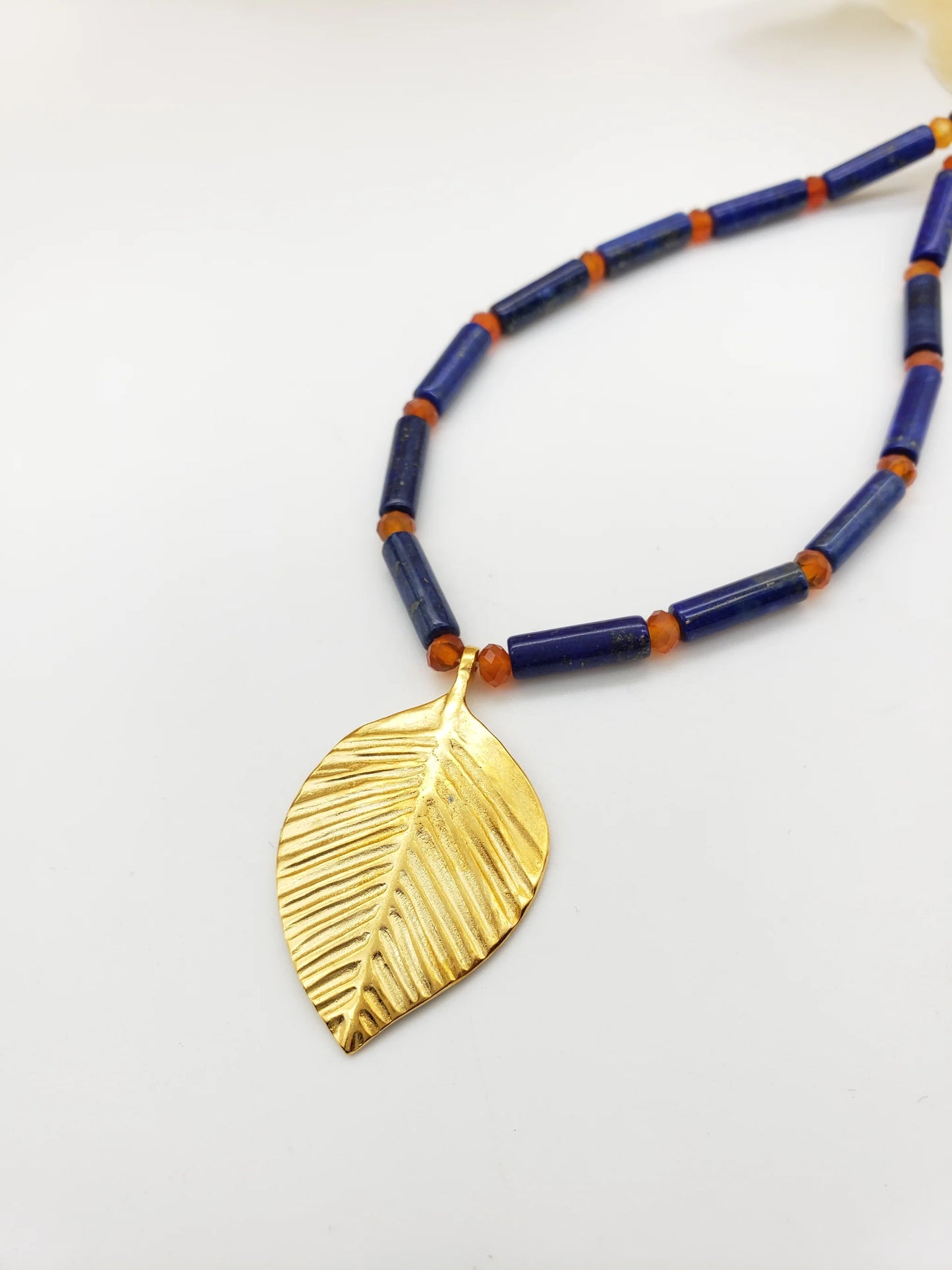 Queen Puabi Single Leaf Necklace made of lapis, carnelian, pewter leaves with gold finish