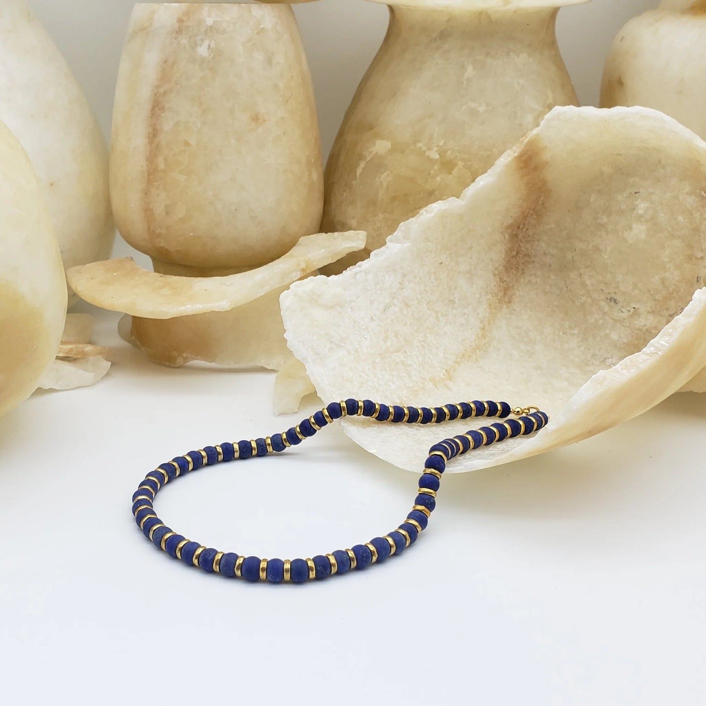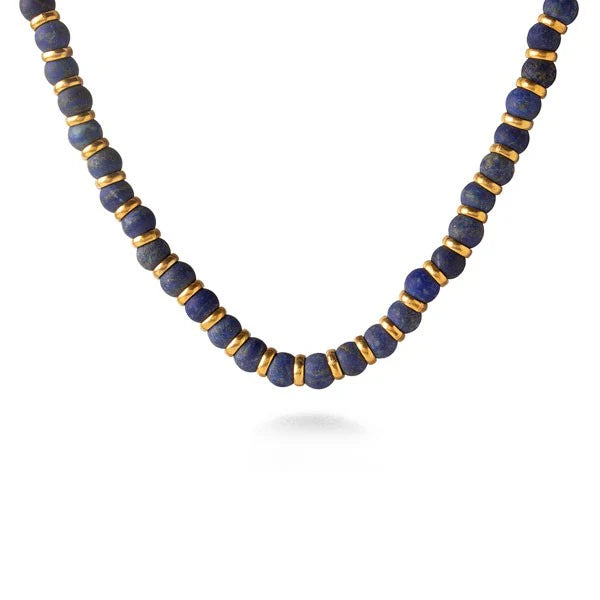 The pairing of brilliant blue lapis lazuli and gleaming gold was highly prized by both the ancient Sumerians and Egyptians, and shows beautifully on our Sumerian Necklace.